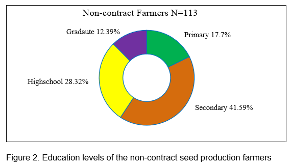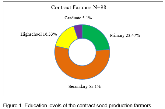There is a statistically significant difference in age and education between farmers at the 99% confidence level, as indicated by the t-test results. Table 2 presents the age distribution of household heads among the sampled farms in the study area, including their frequencies and percentages. Younger farmers were more prevalent among non-contract seed producers. The average age of contract seed producer farmers was 54 years, while that of non-contract seed producers was 51 years.
