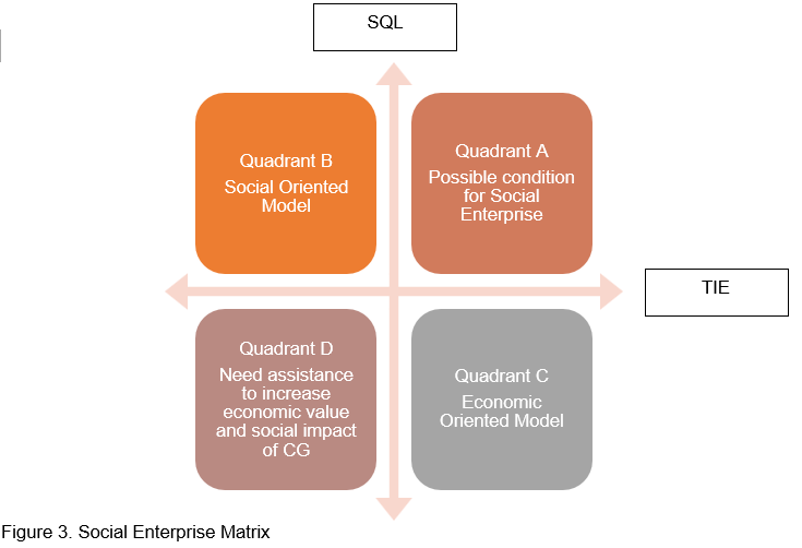 To assess their enterprise potential more systematically, the study employed a dual-axis framework adapted from Saebi et al. (2019) and Roy et al. (2014), focusing on two core dimensions: Social and Quality of Life (SQL) that measure contributions to community well-being, education, and food access; and Technology, Innovation, and Economy (TIE), that evaluate farming systems, internal resource use, and financial viability. This framework enabled the placement of each CG within a four-quadrant matrix as in Figure 3.