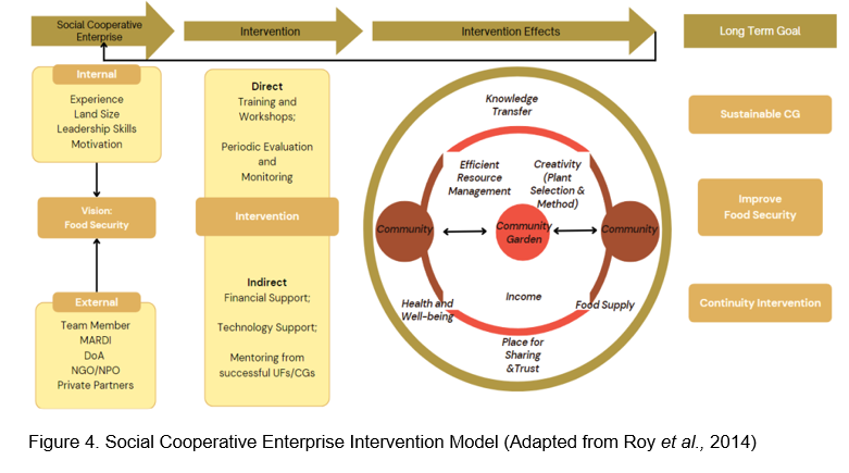 Therefore, the Social Enterprise with Intervention Model presents a more suitable approach, as demonstrated by Roy et al., (2014) in the context of healthcare-focused social enterprise. However, long-term goals for CGs should be robust in terms of food security, and measurement parameters need to consider internal motivation aspects in addition to other factors. To achieve this, a cooperative approach involving both CGs and their stakeholders is crucial. The model details are shown in Figure 4.