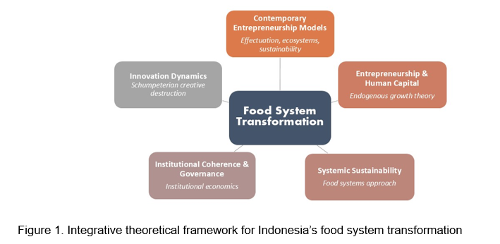 The transformation of national food systems requires a multidimensional theoretical foundation that recognizes innovation, entrepreneurship, and institutions as interconnected drivers of change. This study adopts an integrative framework that combines classical economic theories with contemporary entrepreneurship perspectives to analyze Indonesia’s agricultural transformation.