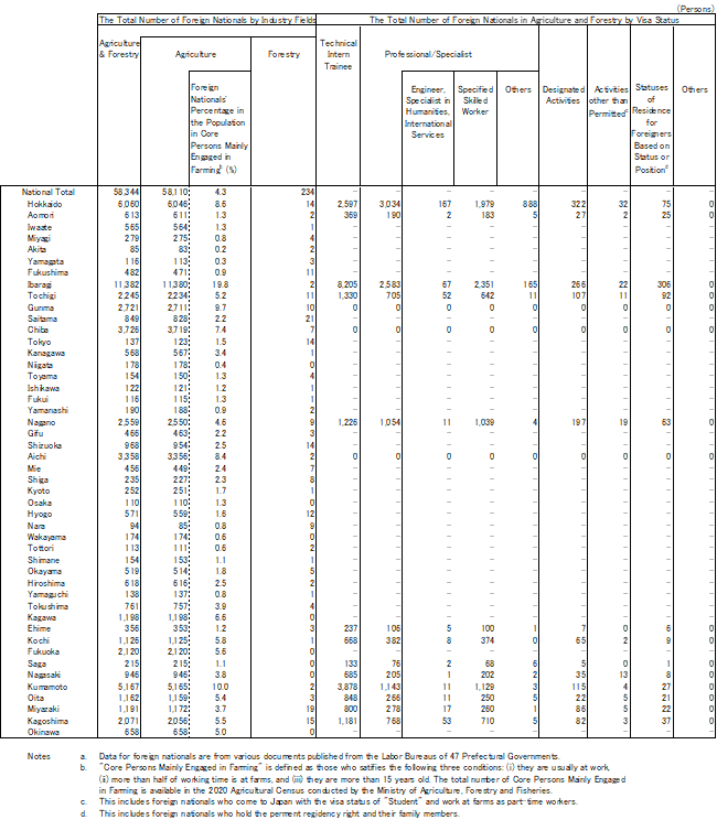 Japan comprises 47 prefectures (including Hokkaido and Tokyo). The Labor Bureaus of 16 prefectures provide data on the total number of foreign nationals employed in the agricultural and forestry industries by visa status (these data are available only for the combined agricultural and forestry industries). The remaining 31 prefectures provide data on the total number of foreign nationals (without visa status). These data are presented in Table 2.