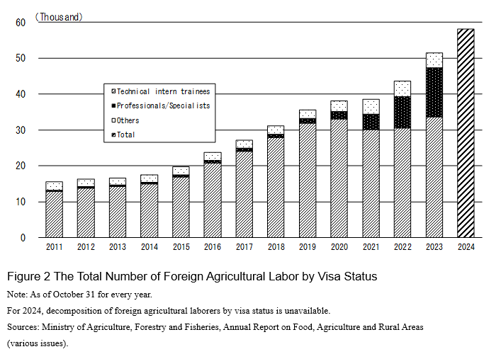 As Figure 2 shows, the total number of foreign agricultural laborers has continued to increase over the last 14 years, even during the COVID-19 pandemic period. This is partly because foreign factory laborers who lost their jobs were allowed to work on farms as part of the Japanese government’s special measures to relieve the unemployed during the pandemic period.