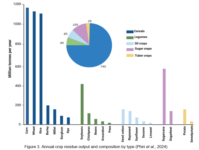 - Crop residues, including rice straws, wheat husks, corn stover, and sugarcane bagasse, account for about 70% of the total agricultural biomass residues (Phiri et al., 2024; Jose et al., 2025).