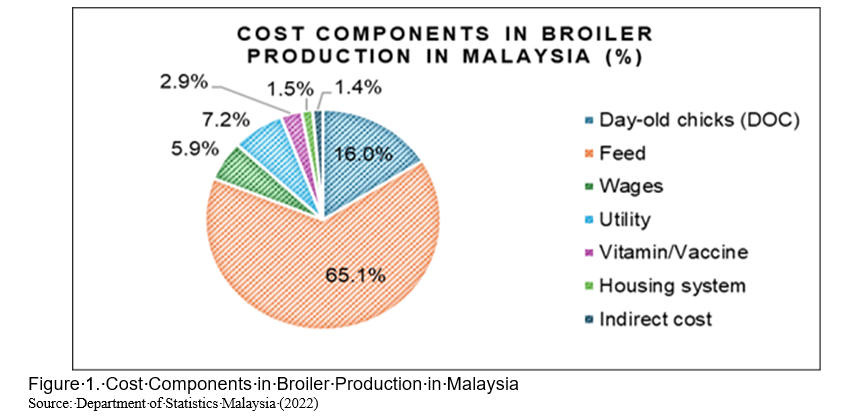 As mentioned earlier, feed is the most significant component of broiler production costs. This pattern is not unique to Malaysia. Comparative global evidence shows that feed and day-old chick costs consistently constitute the dominant cost components across broiler production systems worldwide, making cost competitiveness highly sensitive to upstream input structures rather than farm-level efficiency alone (Thobe et al., 2025).