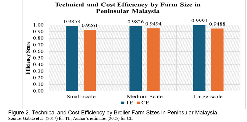 The cost efficiency (CE) results from this study further indicate that broiler farms operate efficiently from a cost perspective. The mean CE values estimated using the stochastic cost frontier model are high: 0.9261 for small-scale farms, 0.9494 for medium-scale farms, and 0.9488 for large-scale farms, with an overall average of 0.9482. Although CE is slightly lower than TE across all categories, as illustrated in Figure 2, both indicators exceed 0.90, demonstrating that Malaysian broiler farms are not only technically efficient but also cost-efficient.