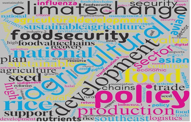 FFTC analyzed the content of these thirty articles using ChatGPT and WordClouds to identify key agricultural policy trends for 2025. Below is a word cloud of the results of analyzing the key phrases of those 30 manuscripts. The core areas of agricultural policy in 2025 were climate change, food security with value chains, sustainable and smart agriculture, agricultural and rural development. Specific national policy tools to pursue these were discussed, such as coping with extreme weather, unstable food value chains, and sustainable agriculture.
